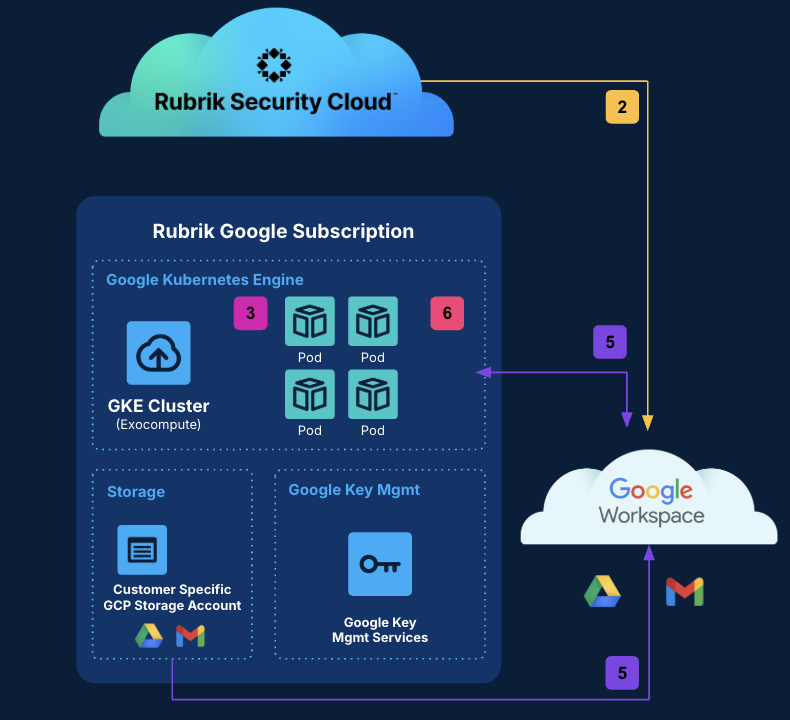 Rubrik Hosted Secure Resources is the vault. It includes a dedicated Google Kubernetes Engine (GKE) for compute, Key Management Services for encryption, and Cloud Storage for data.
