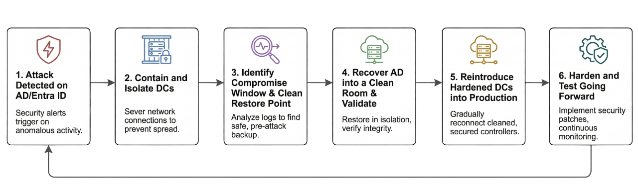 - What you do: Upload a verified, clean version of AD into the Clean Room. Perform a forced reset of the KRBTGT password and administrative accounts. Reintroduce the hardened DC back into production and execute a mandatory global password reset.
